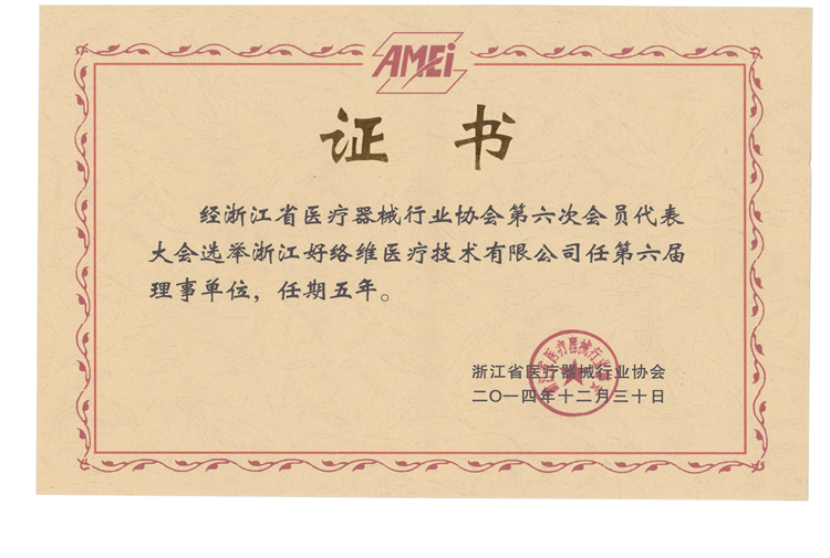• 浙江省醫療器械行業(yè)協(xié)會(huì )理事單位證書(shū)